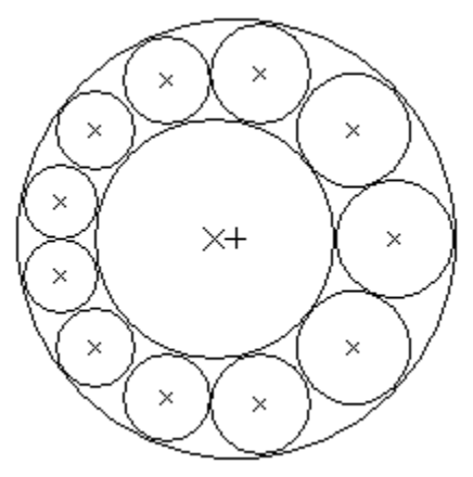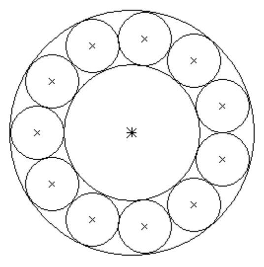 Input consists of a single line containing the diameter, D, (8 ≤ D ≤ 30) of the table (in kingly feet), the number, N, (7 ≤ N ≤ 40) of knights to be seated, and the offset, O, 0.1 ≤ O < radius of an original trencher) from the center of the table to the center of the central serving platter (as a decimal number of kingly feet).
