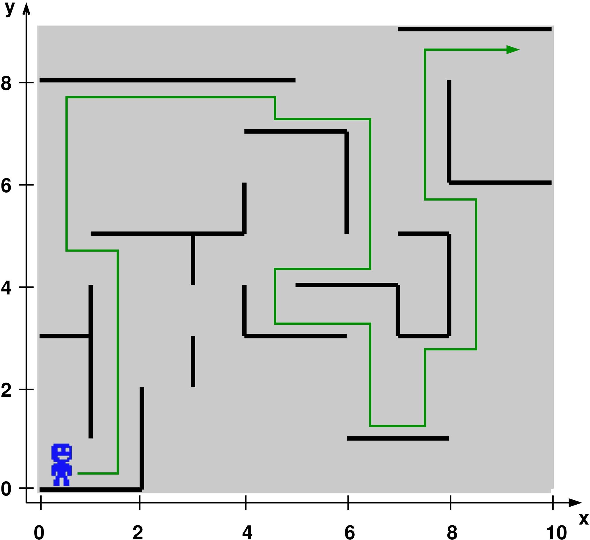 Your task is to find a sequence of button presses which takes you through a maze-like level with platforms and walls, from a given start position to a given final position. In order to receive full points, the sequence needs to be as short as possible.