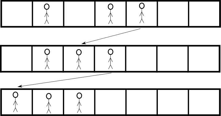 $N$ friends are playing a game. The game is played on a row of $L$ squares, numbered from $0$ to $L - 1$, where squares $i$ and $i+1$ are adjacent to each other. At most one friend stand on each square at any given time. In each step of the game, one friend jumps from its current square to a new (non-occupied) square.