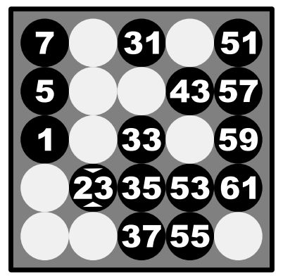 For those who don’t know the game of lingo, here follows a description of the last part of the finals, where you take the balls. You are given a square grid. Some squares in this grid are covered and the other squares contain numbers. A hopper in front of you contains numbered balls; there is exactly one ball for each numbered grid square. You take a ball at random (without replacement) from this hopper for each lingo word you solved in the first part of the finals. When you take a ball, the corresponding square in the grid becomes covered. You win the finals if an entire row, column or diagonal consist of only covered squares.