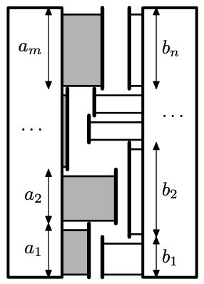 Региональное отделение одного крупного банка заказало два несгораемых шкафа для хранения личных дел своих клиентов. Каждый шкаф имеет несколько ящиков различной высоты, при просмотре снизу вверх ящики в первом шкафу имеют высоту $a_1, a_2, \ldots, a_m$, а ящики во втором шкафу --- высоту $b_1, b_2, \ldots, b_n$.