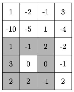 Для решения головоломки требуется найти такой невырожденный прямоугольник с вершинами в центрах ячеек таблицы, и сторонами, параллельными сторонам таблицы, чтобы сумма чисел, записанных в ячейках на границе получившегося прямоугольника, была максимальна.