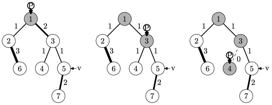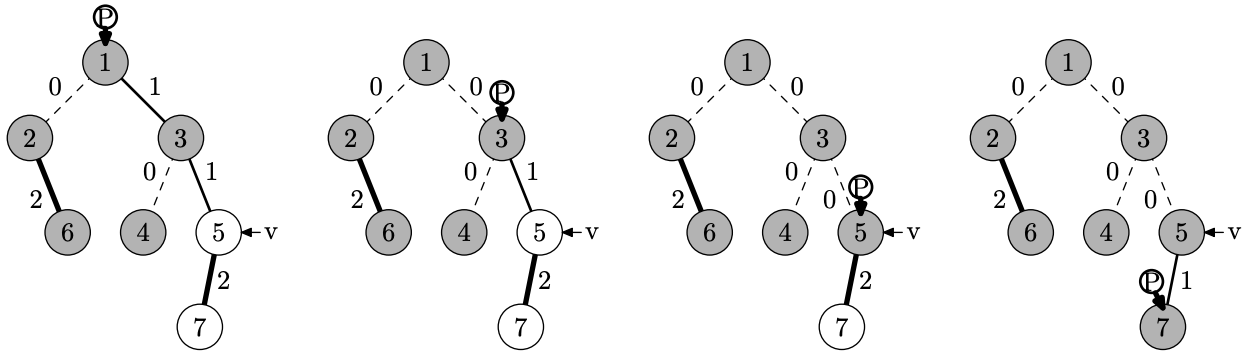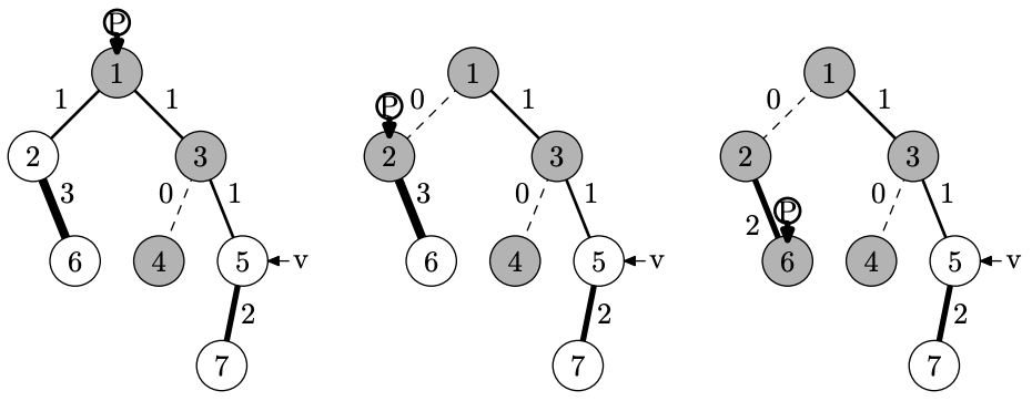В развлекательном центре Е-города был установлен игровой автомат нового поколения. В автомат можно бросить монету и следить за её продвижением сверху вниз по разветвляющемуся лабиринту из трубок. В лабиринте есть $n$ узлов, которые пронумерованы числами от 1 до $n$. При бросании монета попадает в первый узел. Каждый узел лабиринта, кроме первого, имеет одну входящую сверху трубку, по которой монета может в него попасть. Из каждого узла выходит не более двух трубок, идущих вниз, одна из которых ведет налево, а другая --- направо. Каждая трубка имеет некоторую ширину. Монета проваливается в более широкую трубку, а в случае равенства ширины трубок --- в левую.