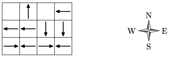 В первой строке входного файла записаны числа $n$ и $m$ --- размеры острова с севера на юг и с запада на восток. Последующие $n$ строк по $m$ символов в каждой описывают текущее расположение крокодилов на острове. Если клетка свободна, то она обозначается точкой <<.>>, а если там находится крокодил, то в ней указано направление, в котором побежит этот крокодил. Направления обозначаются буквами: <<N>> --- север, <<S>> --- юг, <<E>> --- восток, <<W>> --- запад.