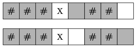 Игра происходит на поле из $8$ клеток, на котором расставляются $2$ корабля, состоящие из $3$-х клеток каждый. Все допустимые расстановки кораблей приведены на рис. 1. Клетки, отмеченные <<#>>, заведомо заняты. Таких клеток $4$.