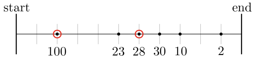 Figure K.1: Illustration of sample input. Metropolitan areas are depicted as points on the line. The optimal placement of stations is given in red circles, at distances 2.0 and 6.0 from the start of the line, with respective utility 100 and 23 · 1/2 + 28 · 1 + 30 · 1/2 + 10 · 1/4 + 2 · 1/16 = 57.125.