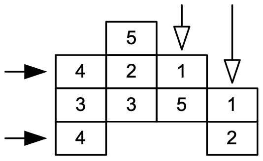 Например, на рисунке показан пример позиции в игре, когда можно сделать два хода: снять две фишки четвертого цвета, поскольку они являются самыми левыми в своих горизонталях, либо снять две фишки первого цвета, поскольку они являются самыми верхними в своих вертикалях.