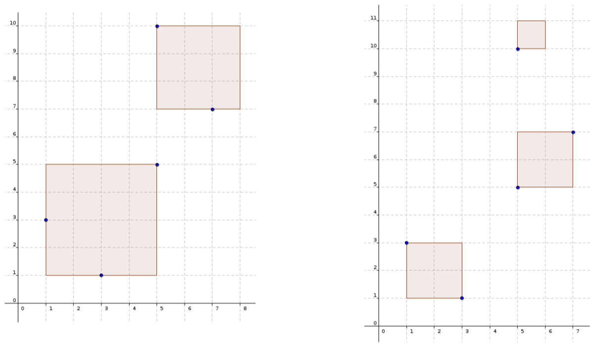 We say that a square covers a point if the point is fully inside it or lies on its vertices or sides. Two squares are disjunct if their sides doesn’t intersect or touch, and neither of the squares is fully contained in the other square.