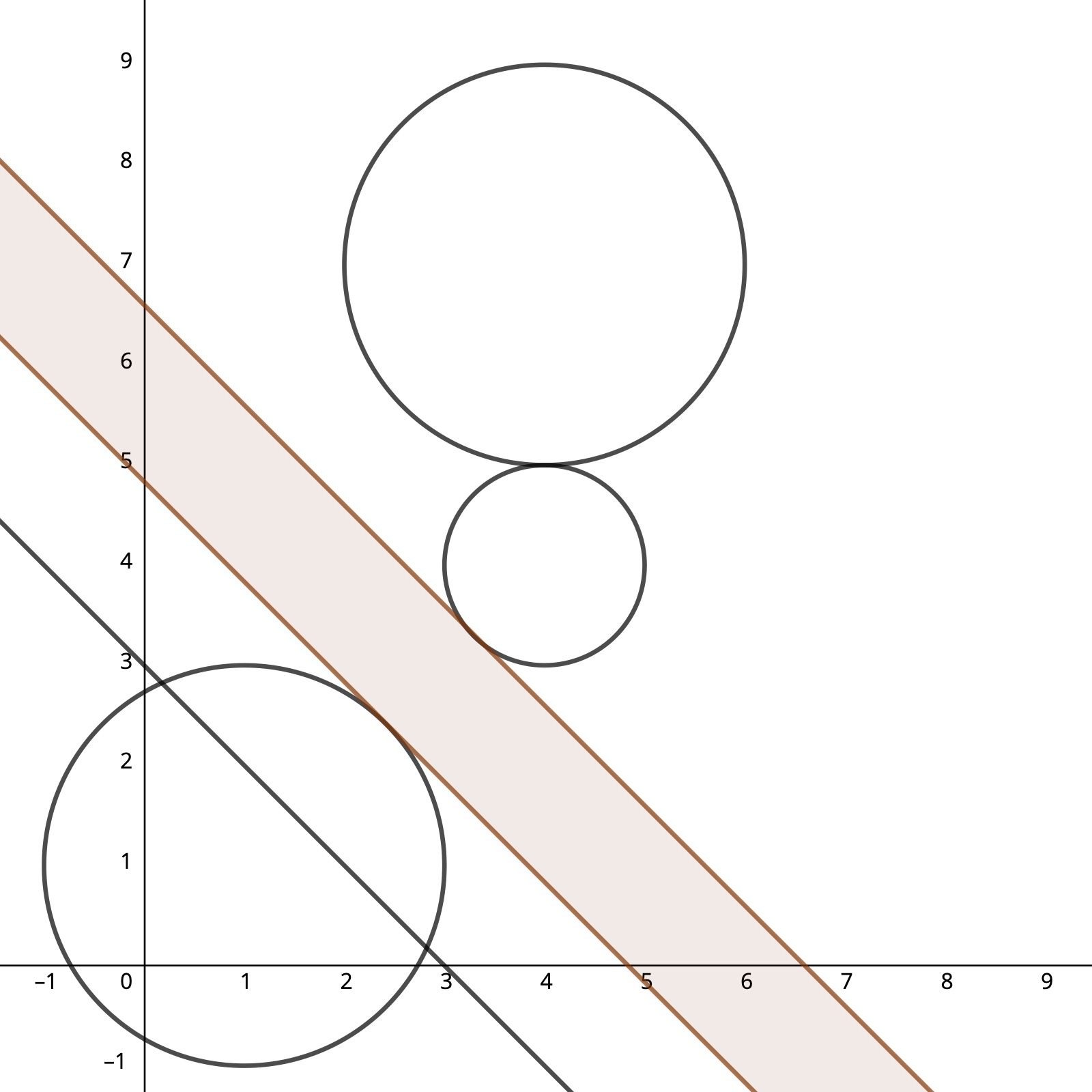 For simplicity, let's represent each tree as a circle on plane with Cartesian coordinates. Build a road of infinite length and maximum width parallel to straight line, that passes through two given points.