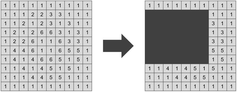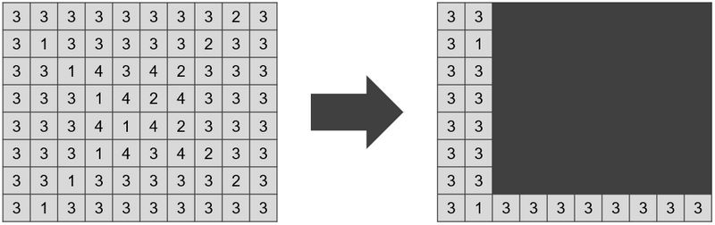 例えば,左上をピクセル (3, 1),右下をピクセル (10, 7) とする長方形領域を隠すと,番号 1, 3 の色だけが見え,その種類の数は 2 となる.この場合,隠すピクセルは 56 個となり,条件を満たす.