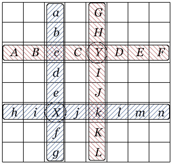 어떤 농장은 다음 그림과 같이 가로 세로 8×8의 단위 구역으로 나누어져 있다. 이 농장에는 많은 곡식을 생산하기 위하여 비료액 또는 제초제를 뿌리는 자동분무기가 단위 구역에 설치되어 있다. 이 자동분무기는 놓인 위치에서 상하좌우 4방향으로 액체를 뿌린다. 예를 들어 X 구역에 자동분무기가 놓여있다면 그 장치로 부터 액체가 뿌려지는 단위 구역은 {X,a, b,c,d,e,f,g,h,i,j,k,l,m,n}이다. 만일 Y 구역에 자동분무기가 놓여있다면 액체가 뿌려지는 단위 구역은 {Y,A,B,c,C,D,E,F,G,H, I,J,k,K,L}이다.