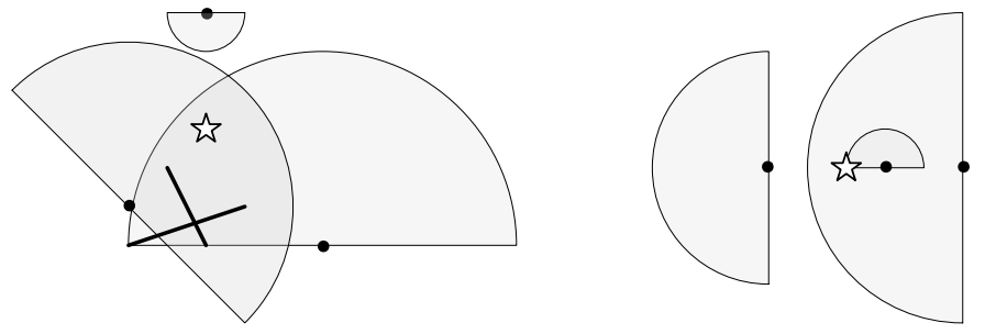 To make the game interesting, there are walls placed in the yard to obscure vision. Each pirate has a field of view that determines what they can see. Each pirate can see a certain distance away and can only see in a semi-circle based on the direction they are looking (see image below). A point cannot be seen in a pirate's field of view if either another pirate or some part of a wall is directly between the point that is being looked at and the pirate that is looking. Each pirate is a single point, and each wall is an infinitely thin line.