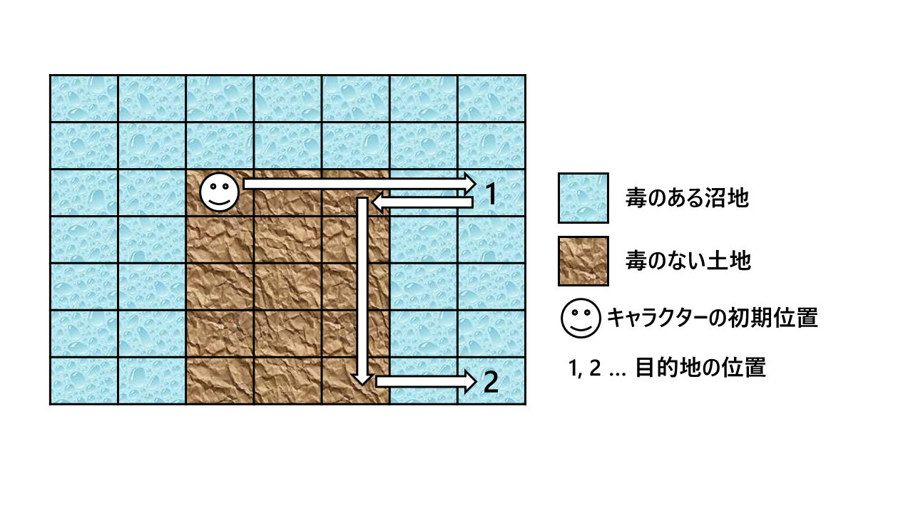 入力例を以下の図に示す.(3, 3) から (5, 3) の間は毒のない土地であるが (6, 3) と (7, 3) は毒のある沼地であるため,1 番目の目的地に移動するまでにダメージを 2 回受ける.1 番目の目的地から 2 番目の目的地まで下方向に 4 回移動して最短距離で移動した場合は,すべてのマスが毒のある沼地であるためダメージを 4 回受ける.遠回りして毒のない土地を通った場合は,(6, 3),(6, 7),(7, 7) の毒のある沼地に入るためダメージを 3 回受ける.ダメージを受ける回数を最小化するような移動方法を選んだとき,ダメージを受ける回数は 5 回である.