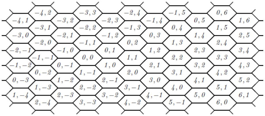 ここは, 地面が正六角形を敷き詰めたマス目になっている街である. 各マスは, 下の図のように2 つの整数で表される.