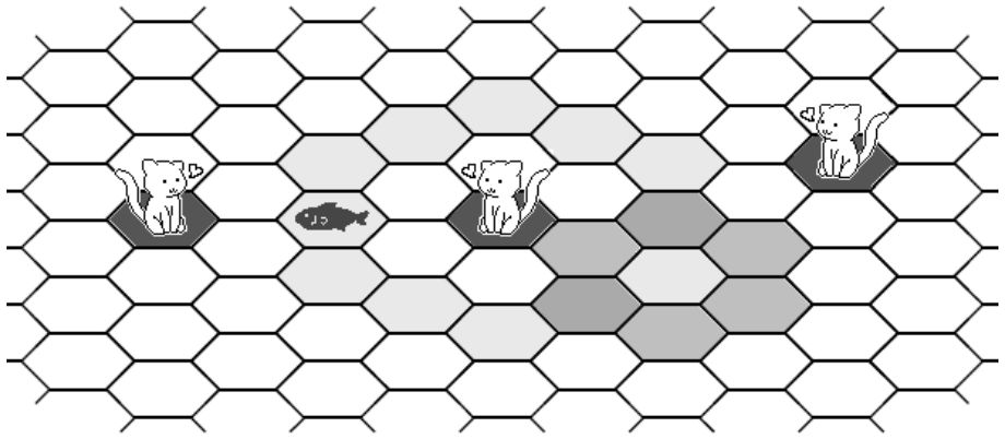 この街にはねこの縄張りとなっているマス目がいくつかある. 縄張りは正六角形の周をなすマス目の集合n個の合併として表される. 黒うさぎはねこの縄張りに立ち入ることはできるが, ブロックすることはできない.つまり, ねこは縄張り内であれば自由に動ける.