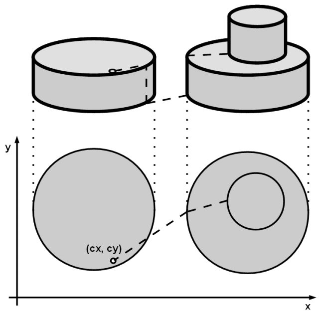 In the race, the contestants drive their cars on a large, flat stage with N cylindrical discs on it. Some discs are lying on another disc but no disc runs off the edge of the disc underneath. All cylindrical discs has the same height (or, “thickness”.) All edges of discs never touch or intersect each other.