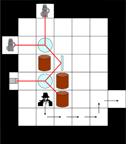 In this room, there are pillars, mirrors and crystals. A mirror reflects a laser beam. The angle of a mirror should be vertical, horizontal or diagonal. A crystal split a laser beam into two laser beams with θ±(π/4) where θ is the angle of the incident laser beam. He can push one mirror or crystal at a time. He can push mirrors/crystals multiple times. But he can push up to two of mirrors/crystals because the door will be locked forever when he pushes the third mirrors/crystals.