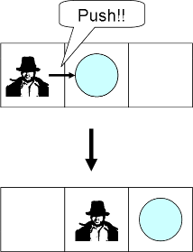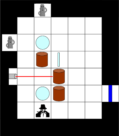 He can move from a square to the neighboring square vertically or horizontally. Please note that he cannot move diagonal direction. Pillars, mirrors and crystals exist on the center of a square. As shown in the figure 2, you can assume that a mirror/crystal moves to the center of the next square at the next moment when he push it. That means, you don't need to consider a state about pushing a mirror/crystal.