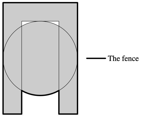 To be specific, the form of his building is union of a cylinder and a prism. You may consider the twodimensional projection of the form, i.e. the shape of the building is considered to be union of a circle C and a polygon P. The fence surrounds the outside of the building. The shape of the building may have a hole in it, and the fence is not needed inside the building. An example is shown in the figure below.