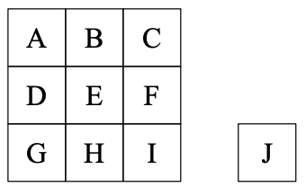 Each of cells labeled from A to J contains one number from 1 to 10, where no two cells contain the same number. The sums of three numbers in the same rows, in the same columns, and in the diagonals in the 3 × 3 cells must be congruent modulo the number in the moduic cell. Here is an example Moduic Square: