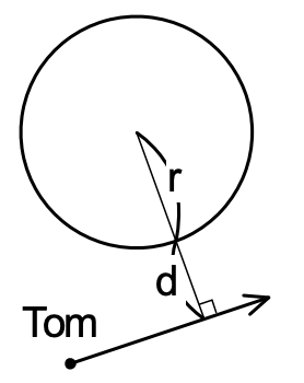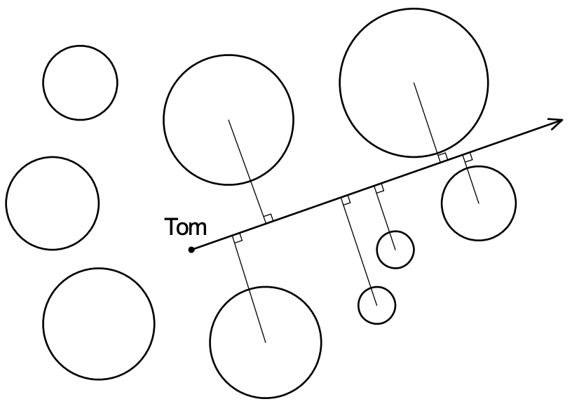 where Pi is a positive number called the power of the object i, ri is the radius of the object i, and di is the distance between Tom and the circumference of the object when he gets to the closest point.