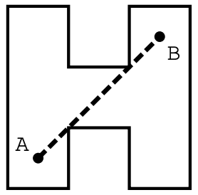 Your mission is to answer the sequence of the coordinates of turning points of the shortest cable route including those of both ends A and B for each plan. So, you are to answer as: (1 1) (2 2) (8 4) (9 5) for the example of Figure 1.