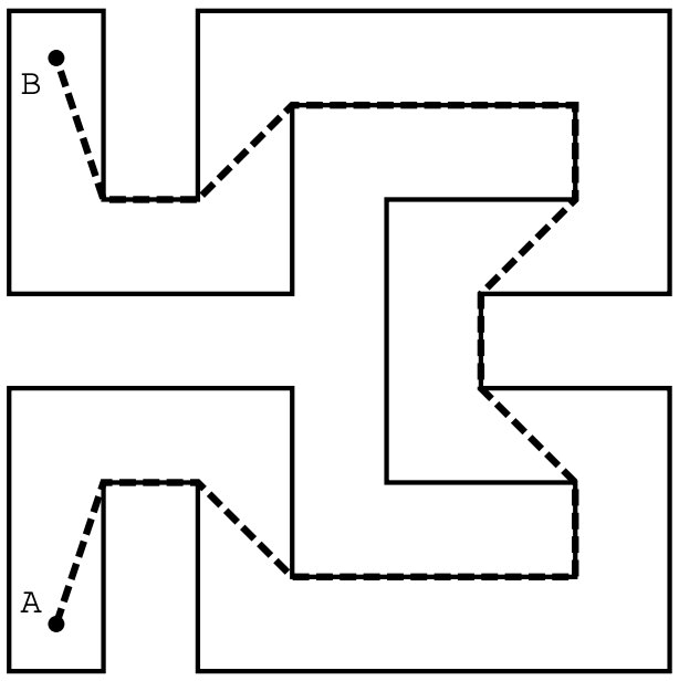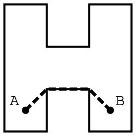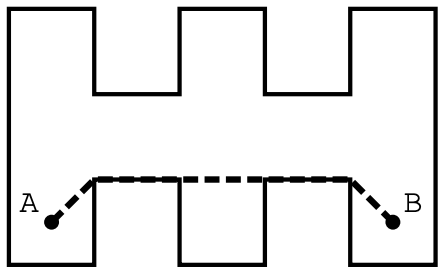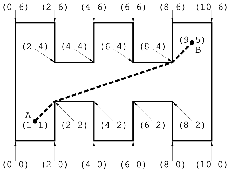 Figure 1 is a plan of his study. Integers in a pair of parentheses like (0 0) are x- and ycoordinates of the nearest pillar or hub or terminal. Between two adjacent pillars are walls indicated by the solid lines. Suppose A is the position of the hub and B his terminal, then the shortest cable may run as drawn with a broken line.