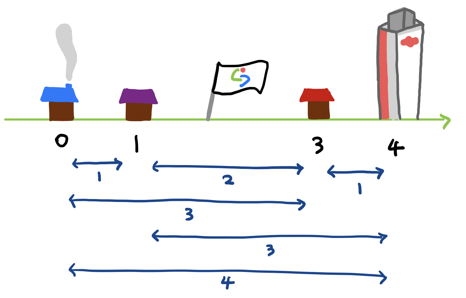 용산구에 있는 세 집의 위치가 각각 $P_1 = 0$, $P_2 = 1$, $P_3 = 3$이었다면, 집들 사이의 거리들은