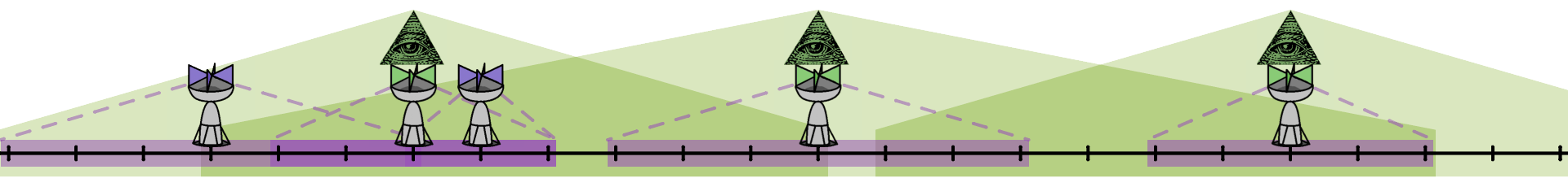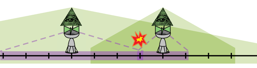 토끼는 새로운 2세대 통신 방법을 개발했다. 이 통신 방법을 사용하면 대용량 통신을 할 수 있고, 통신 거리가 $3$배씩 늘어서 $i$ 번 기지국과 거리가 $3H_i$ 이하인 모든 위치에 2세대 통신 방법으로 통신을 할 수 있다. 즉 $p$가 폐구간 $\left[X_i-3H_i, X_i+3H_i\right]$ 안에 속해있으면 위치 $p$에서 $i$ 번째 기지국과 2세대 통신 방법으로 통신을 할 수 있다. 2세대 통신 방법에는 치명적인 문제가 있는데, 기지국이 너무 촘촘하게 있으면 서로 간섭을 일으킬 수 있다. 어떤 위치가 2개 이상의 기지국과 1세대 통신 방법으로 통신을 할 수 있을 정도로 가까이 있으면, 해당 위치에서 전파 간섭이 일어난다. 다시 말하면, $\left\lvert X_j-X_k \right\rvert \le H_j + H_k$인 경우에 $j$ 번 기지국과 $k$ 번 기지국이 담당하는 범위가 겹쳐서 전파 간섭이 일어난다.