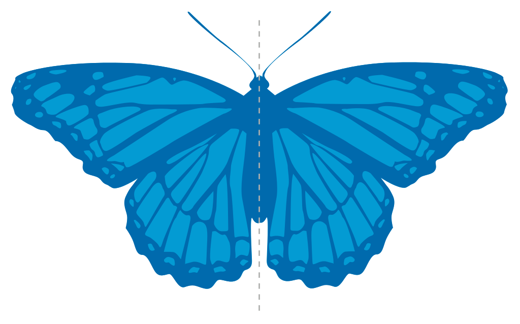 위 그림은 회색 점선으로 표시된 직선에 대하여 대칭을 이루고 있다. 이렇듯 선대칭을 이루는 그림을 "데칼코마니"라고 부른다.