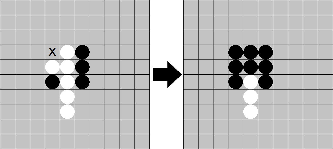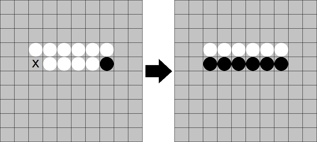 돌은 가로, 세로, 대각선의 총 8방향으로 뒤집을 수 있으며, 동시에 여러 방향에 있는 돌을 뒤집을 수도 있다. 예를 들어, 아래의 그림에서 X 위치에 흑돌을 놓으면 3개의 백돌이 뒤집혀 흑돌이 된다.