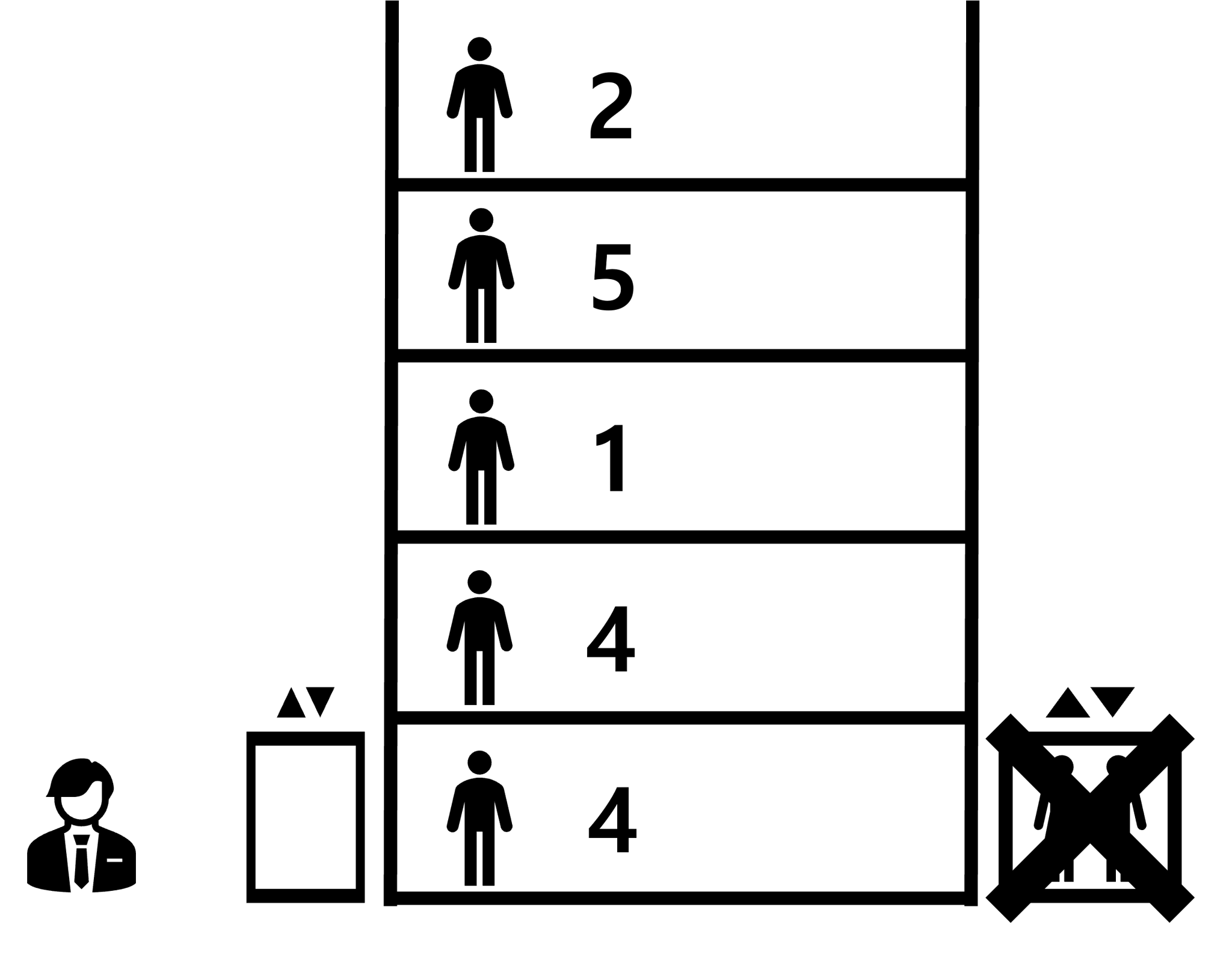 예제 1의 경우 1층에서 사람을 태워 4층으로 이동시켜 내려주고, 4층에서 사람을 태워 5층으로 이동시켜 내려주고, 5층에서 사람을 태워 2층으로 이동시켜 내려주고, 2층에서 사람을 태워 4층으로 이동시켜 내려주고, 3층으로 이동하여, 3층에서 사람을 태워 1층으로 이동시켜 내려주면 된다.