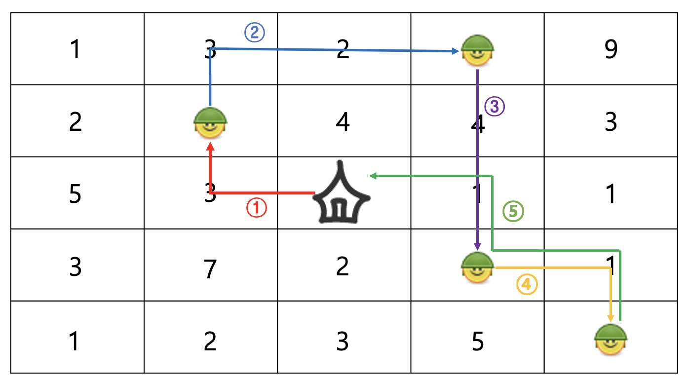 아무것도 하기 싫은 호열이를 위해 부대에서 출발해 탈영병을 모두 잡은 후 부대로 복귀하는데 드는 최소 비용을 대신 구해주자.