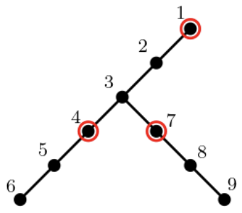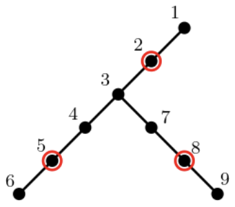 For example, Figure G.1 below shows a tree $T$ with nine nodes and eight edges. For $K = 1$, if three warehouses are located at nodes $2$, $5$, and $8$, marked with red circles as in Figure G.1 (a), then the distance of every node of $T$ to the closest warehouse is at most one. Two warehouses are not enough to satisfy the distance restriction, so three warehouses are the minimum. For $K = 2$, three warehouses are still required; warehouses at nodes $2$, $5$, and $8$ for $K = 1$ are the ones for $K = 2$. Of course, the locations of the minimum number of warehouses are not unique; three warehouses at nodes $4$, $7$, and $1$ as in Figure G.1 (b) also satisfy the distance restriction for $K = 2$.