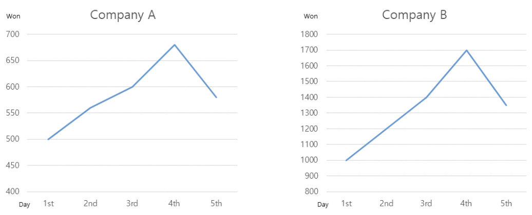 Mr. Kim is a stock market analyst. Recently, he found something interesting while looking at the stock charts of several companies. Most of the stocks that rose for four consecutive days fell the next day. Also, the stock price that fell on the fifth day was often located between the price of the second and third days of the stock price during the four days of the uptrend. For example, Company A's stock price was 500 won, 560 won, 600 won, and 680 won for four consecutive days, and the fifth day's stock price of Company A was 580 won. Also, Company B's stock price was 1,000 won, 1,200 won, 1,400 won, and 1,700 won for four consecutive days, and the fifth day's stock price of Company B was 1,350 won.