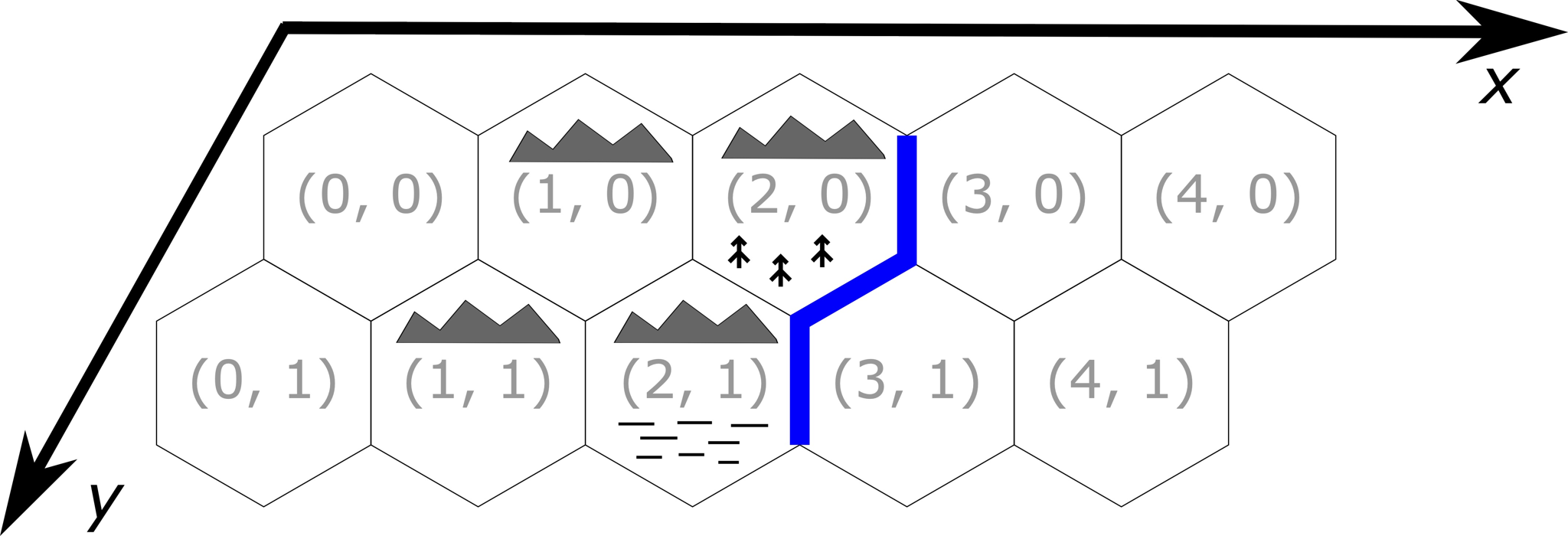 Terrain and surface are specified for each cell. The terrain can be either a plain, a hill, or a mountain, and the surface can be grassland, forest or marsh. Rivers can flow along cell margins.