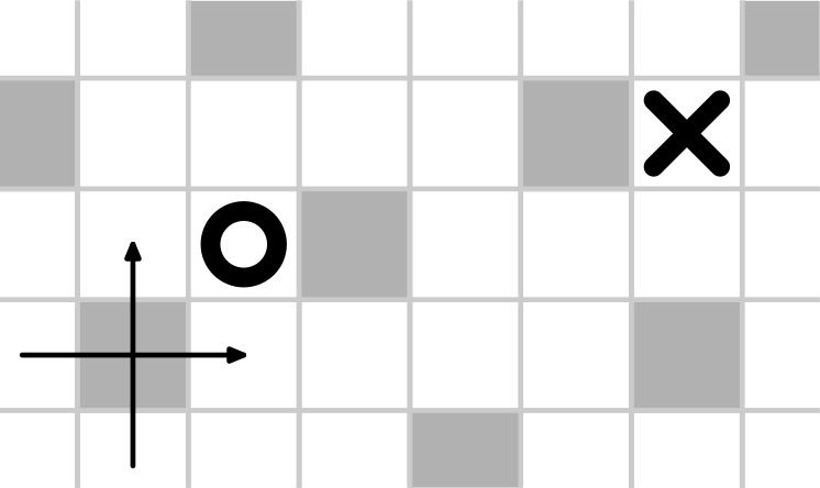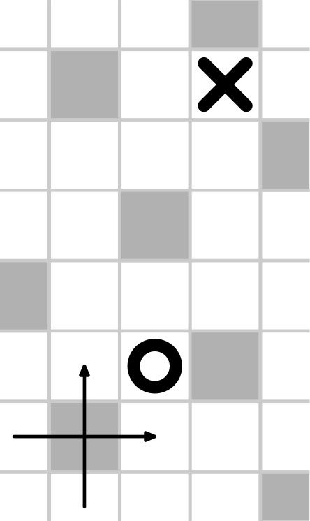 Each fifth square contains an obstacle: more precisely, the obstacles are placed in all squares with centers at points $(2 i + j, i - 2 j)$ for all possible integer $i$ and $j$. The exact placement of obstacles is visualized in the example notes below. All other squares are free.