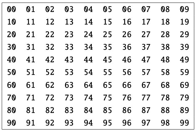 すなわち,数字 2 つによる 10 × 10 通りで表される.JOI 国の辞書では,この表によって定まる文字の順 番によって単語を並べている.表の上の行にある文字がより早く,同じ行の文字ではより左の文字が早い.