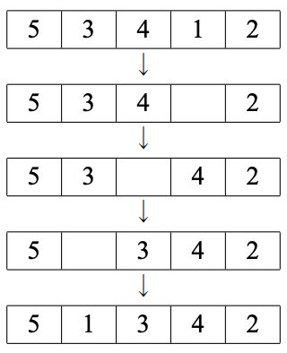 例えば,本が左から 5, 3, 4, 1, 2 の順で並んでいるとき,本 1 を取り出し,本 4 と本 3 を順に右に動かし, 本 1 を本棚に戻すことで,本棚の本を左から 5, 1, 3, 4, 2 の順にすることができる.(下図)