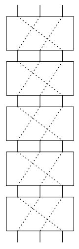 ここで,IC (2, 3, 1) を 5 個直列につなぐと,次の図のように最初の入力 3, 1, 2 がそれぞれ最 後の出力 1, 2, 3 に対応するので,結局 IC (3, 1, 2) と同じ動作をすることになる.