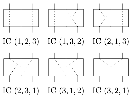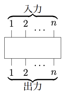この IC では,n 個の入力の各々がそのまま n 個の出力となって出てくるのだが,どの入力 がどの出力に対応しているかはわからない.IC は出力 1, . . . , n に対応する入力の番号を並べる ことで記述する.