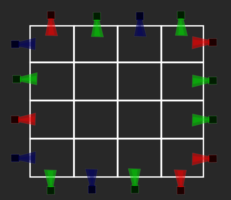 Din vän håller på att designa en ljusshow för avslutningsceremonin i årets Programmeringsolympiadsfinal. Salen där ceremonin hålls kan ses som ett rutnät med $R$ rader och $C$ kolumner. Utmed de fyra sidorna är olika lampor monterade, vilka kan lysa med en av tre olika färger: rött, blått eller grönt. Under ceremonin är tanken att lamporna skiftar i olika mönster.