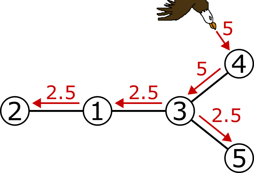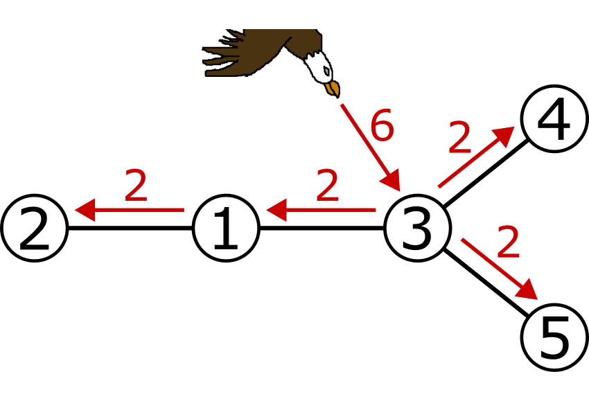 Den andra örnen kraschar i nod $3$ med fart $6$. Från nod $3$ sprids skakningen till nod $1$, $4$ och $5$. Skakningarna i nod $4$ och $5$ har ingenstans att ta vägen men skakningen i nod $1$ sprids till nod $2$.