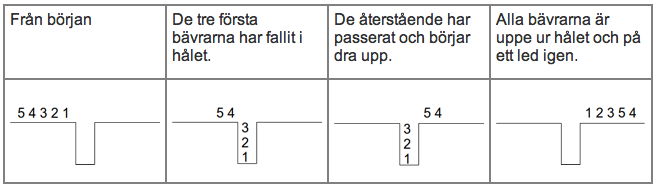 Hålen är tillräckligt djupa för att ett visst antal bävrar ska falla i dem. När hålet väl är fullt med bävrar kan de bakomvarande bävrarna passera ovanpå bävrarna i hålet, tills slutligen den sista bävern i raden drar upp bävrarna ur hålet, den översta först och den understa sist. Alltså, om vi har fem bävrar (5 4 3 2 1) som vandrar åt höger (nummer 1 går alltså först och nummer 5 sist i ledet), och de kommer till ett hål där tre bävrar får plats, så skulle följande hända: