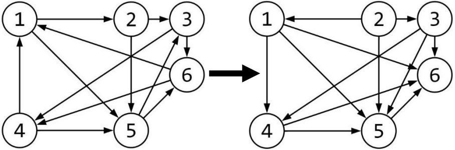 The connections that are reversed are: (1,2), (4, 1), (5, 3), (6, 1), (6, 4). The figure above is showing the spaces, firstly, with the directed connections from Deni’s list and, secondly, after reversing the direction of the connections with corresponding ‘1’ in the output. Clearly, in the beginning using the directed connections (1, 2), (2, 3), (3, 4) and (4, 1) we can start from space 1 and moving along these directed connections, we will return to that space. One can see that Deni’s condition holds in the resulting board. Notice that there are other valid solutions: (4, 1), (5, 3), (6, 1), (6, 4) (1, 5), (2, 3), (2, 5), (3, 4), (3, 6), (4, 5), (5, 6) |