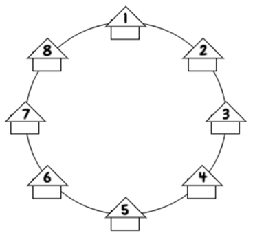 In Olympia, there is a circular village with N houses. They are numbered from 1 to N in the clockwise order. For example, if N = 8, the village would look like on the picture (the circle is the border line of the village):