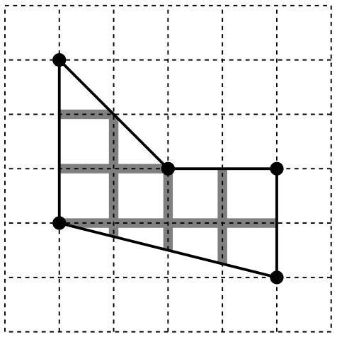 N개의 꼭짓점을 가진 단순 다각형 (Simple Polygon)이 무한한 사각 격자판에 그려져 있다. 단순 다각형은, 두 개의 인접한 변이 오직 하나의 공통된 꼭짓점을 지나고, 이러한 변이 아니라면 교차하거나, 접하지 않는다. 모든 꼭짓점은 정수 좌표를 가진다.