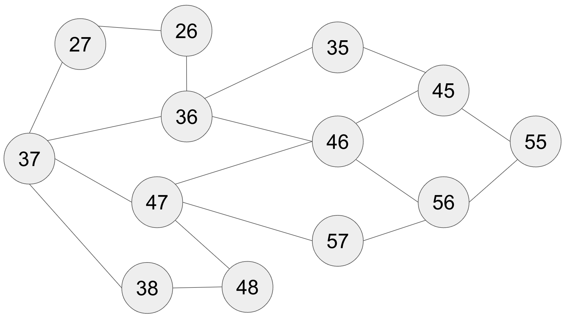 위 규칙에 따라 그래프를 만든 뒤, Alice는 Bob에게 두 정점 $x$와 $y$사이의 최단 경로 중 사전 순으로 정렬했을 시 $K$번째에 해당하는 최단 경로를 찾아보라고 했다. 예를 들어 $L = 2$, $x = 37$, $y = 55$인 경우를 생각해보자. 이 경우 두 노드 사이의 최단 거리는 $4$이며, 아래와 같이 총 여섯 개의 최단 경로가 존재한다. 만약 $K = 3$이라면 정답은 $3$번째 최단 경로인 $37 - 36 - 46 - 56 - 55$가 된다.