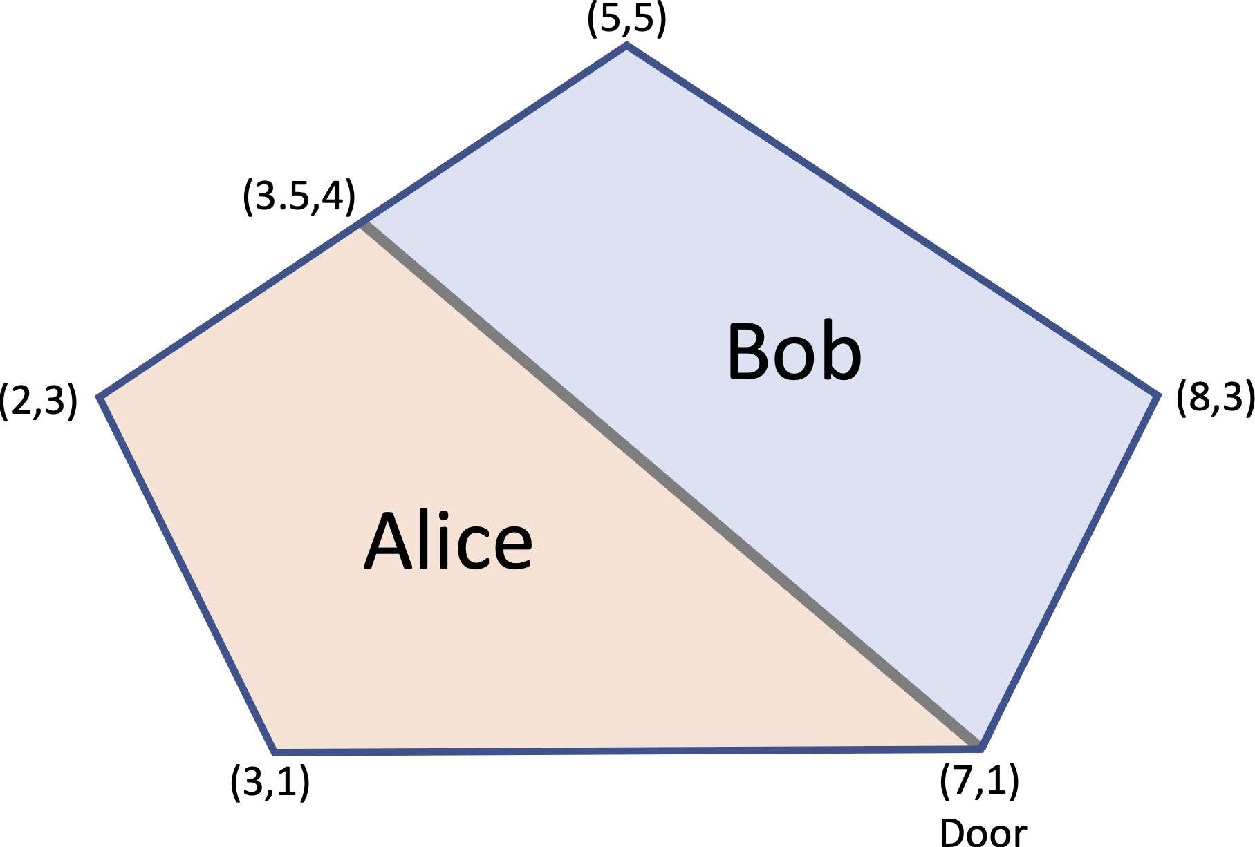 Bob and Alice are roommates at the International College of Polygonal Chambers (ICPC). To avoid conflict, they've agreed to divide their dorm room in half---as closely as possible. However, the room is shaped so irregularly that they need your help!