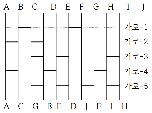 이 사다리에서 점선은 가로 막대가 없음을, 굵은 가로 실선은 옆으로 건너갈 수 있는 가로 막대가 있음을 나타내고 있다.